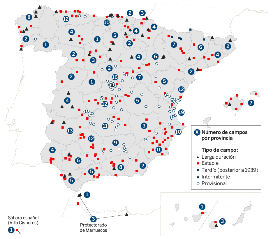 Algunes fonts indiquen que van existir entre 294 i 296 camps de concentració al llarg del país, en els que destaquen: “Los Almendros” y “Albatera” (Alacant), “Castuela” (Badajoz), “Cartuja de Porta Coeli” (València), o “La Corchuela” (Sevilla).